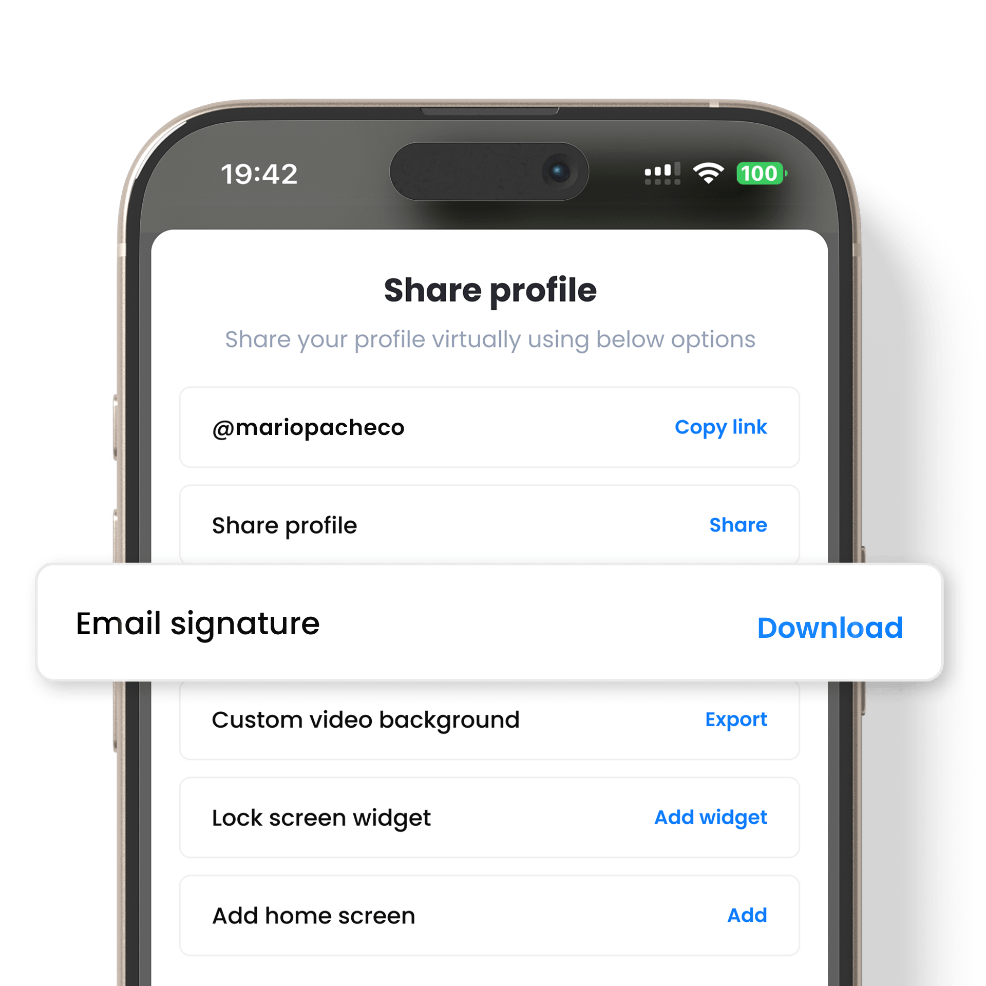 أضف بطاقة عملك الرقمية إلى توقيع بريدك الإلكتروني للحفاظ على تناسق العلامة التجارية وجعل كل بريد إلكتروني مقدمة احترافية. (قريبًا)